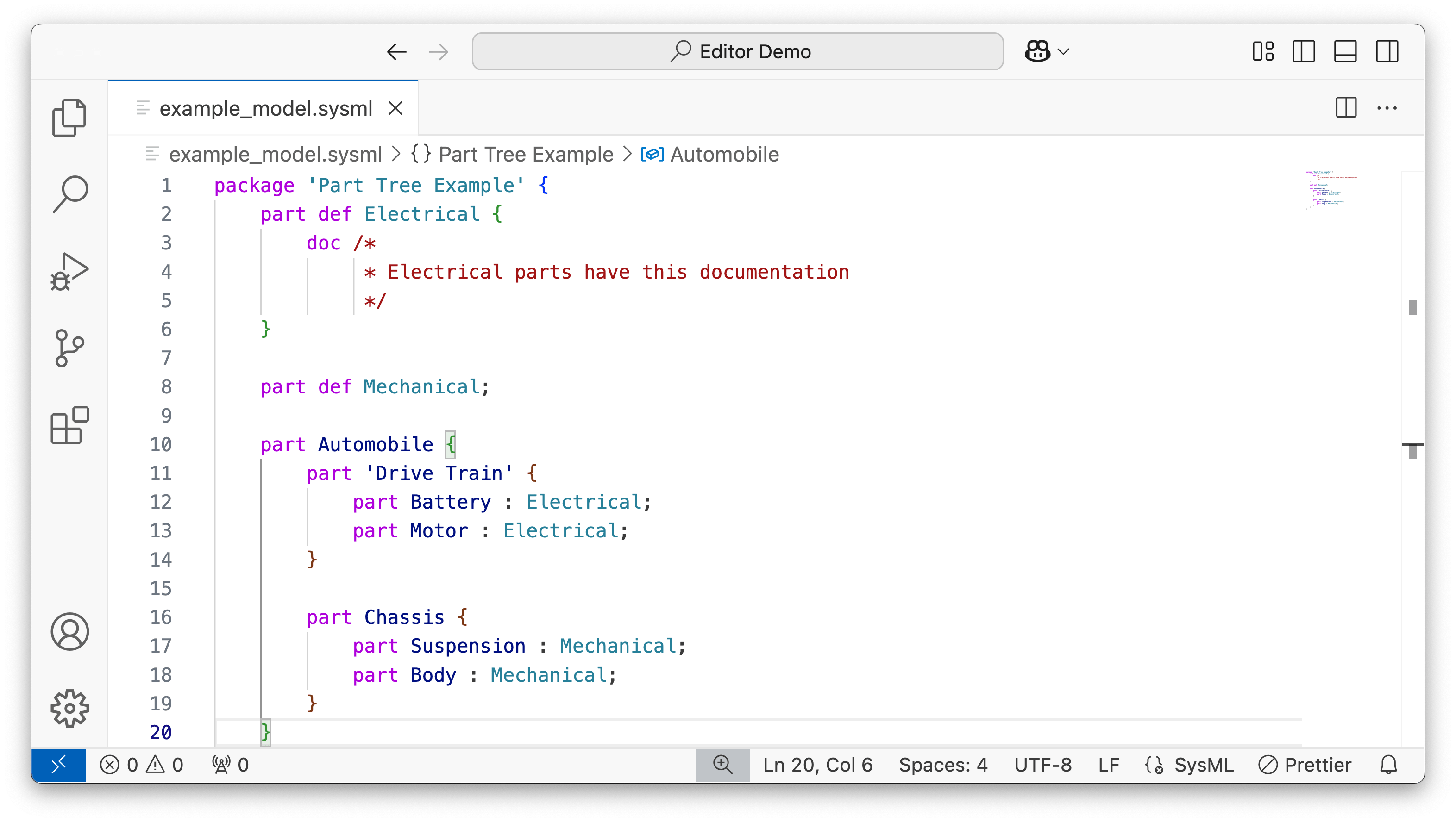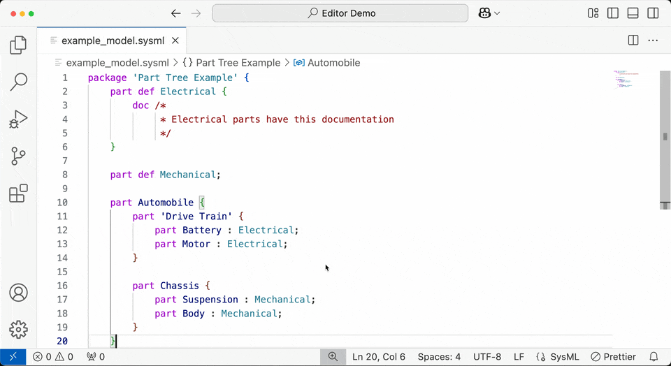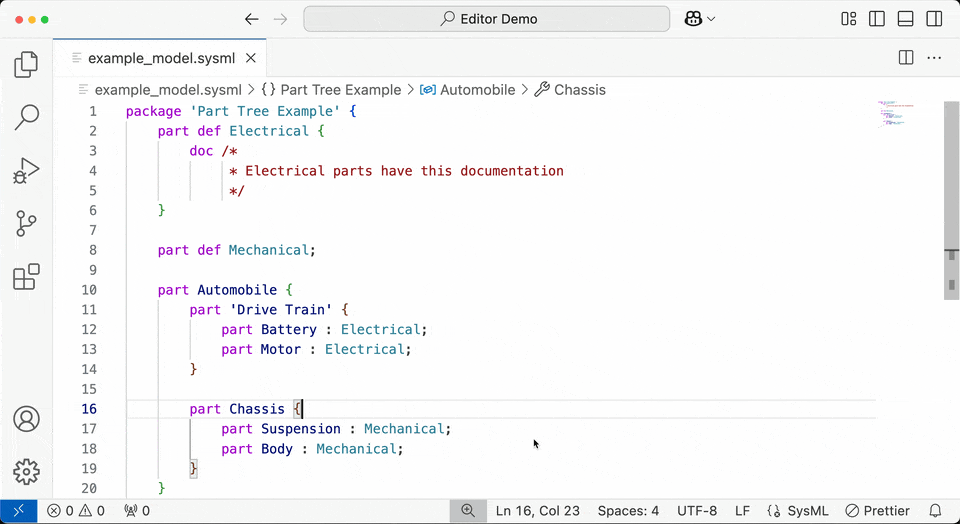 Syside language server can automatically format your model to maintain consistent style. To enable automatic formatting: