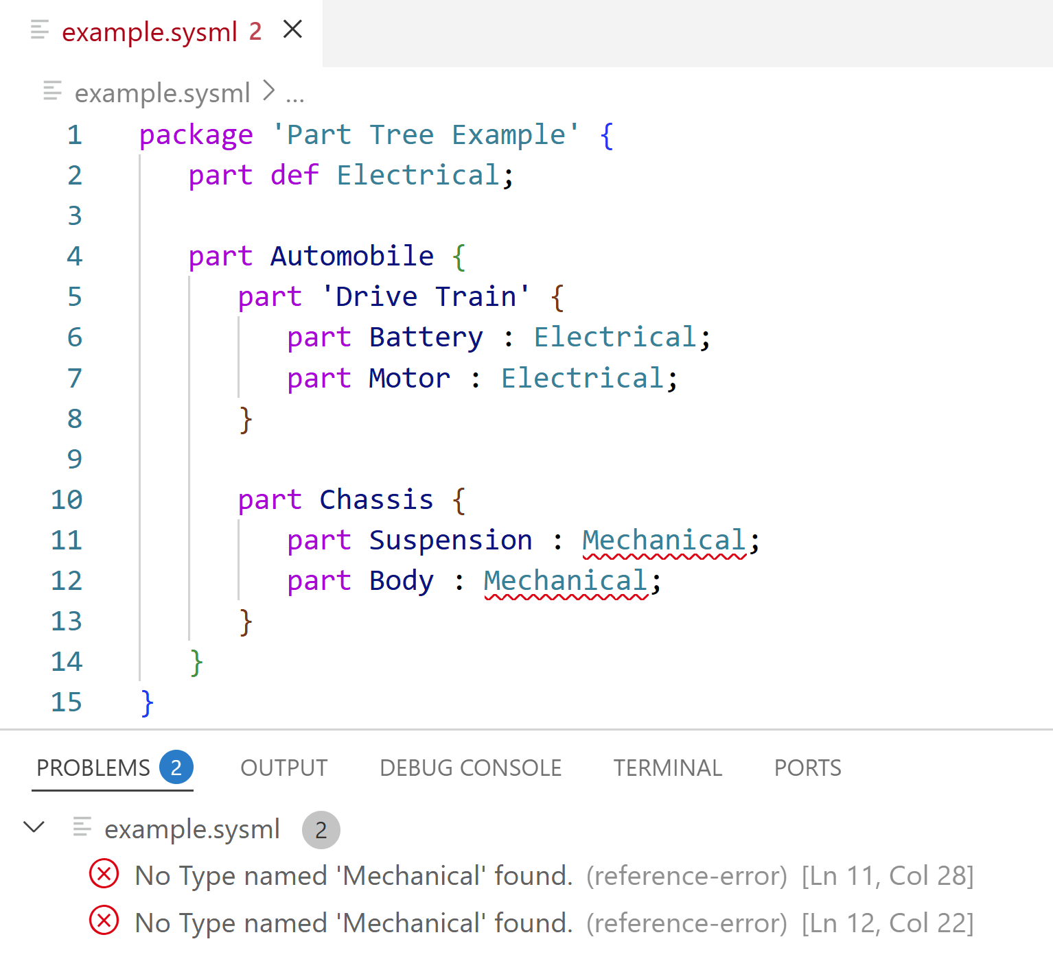 example.sysmlwith the following content:package 'Part Tree Example' { part def Electrical; part Automobile { part 'Drive Train' { part Battery : Electrical; part Motor : Electrical; } part Chassis { part Suspension : Mechanical; part Body : Mechanical; } } }