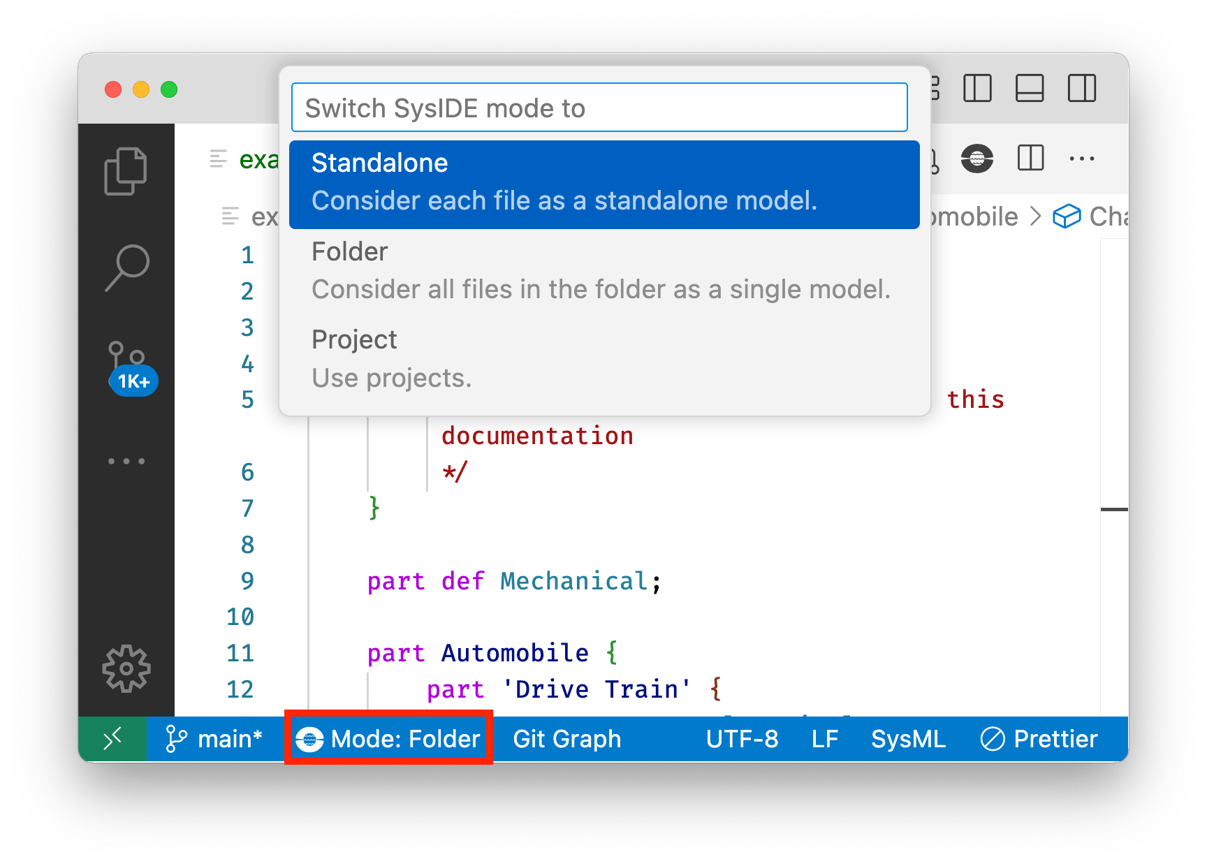You can change the visualization mode by looking at the bottom of your VS Code window, where you should find a Syside logo with “Mode: Folder” written next to it. Clicking on it will open a quick pick dialog where you can select the desired mode.