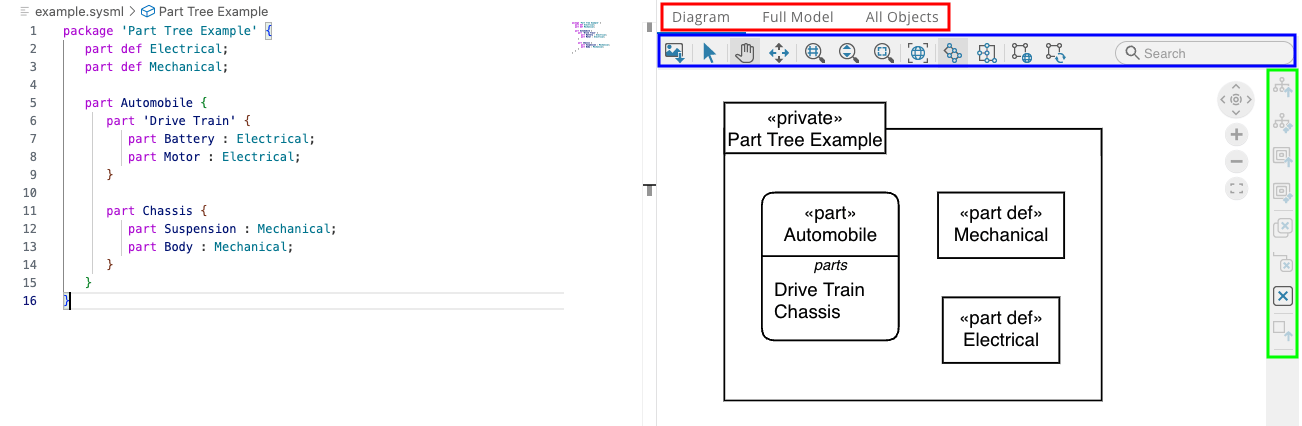 Tabs (Red): The top-most panel containing tabs “Diagram”, “Full Model”, and “All Objects”.