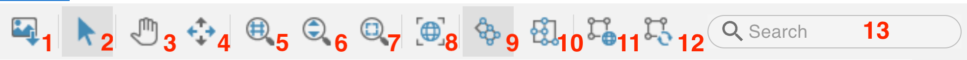 View Tools (Blue): The lower panel below it containing tools such as “Select”, “Zoom”, “Pan”, “Zoom in”, “Zoom out” and “Fit to screen”.