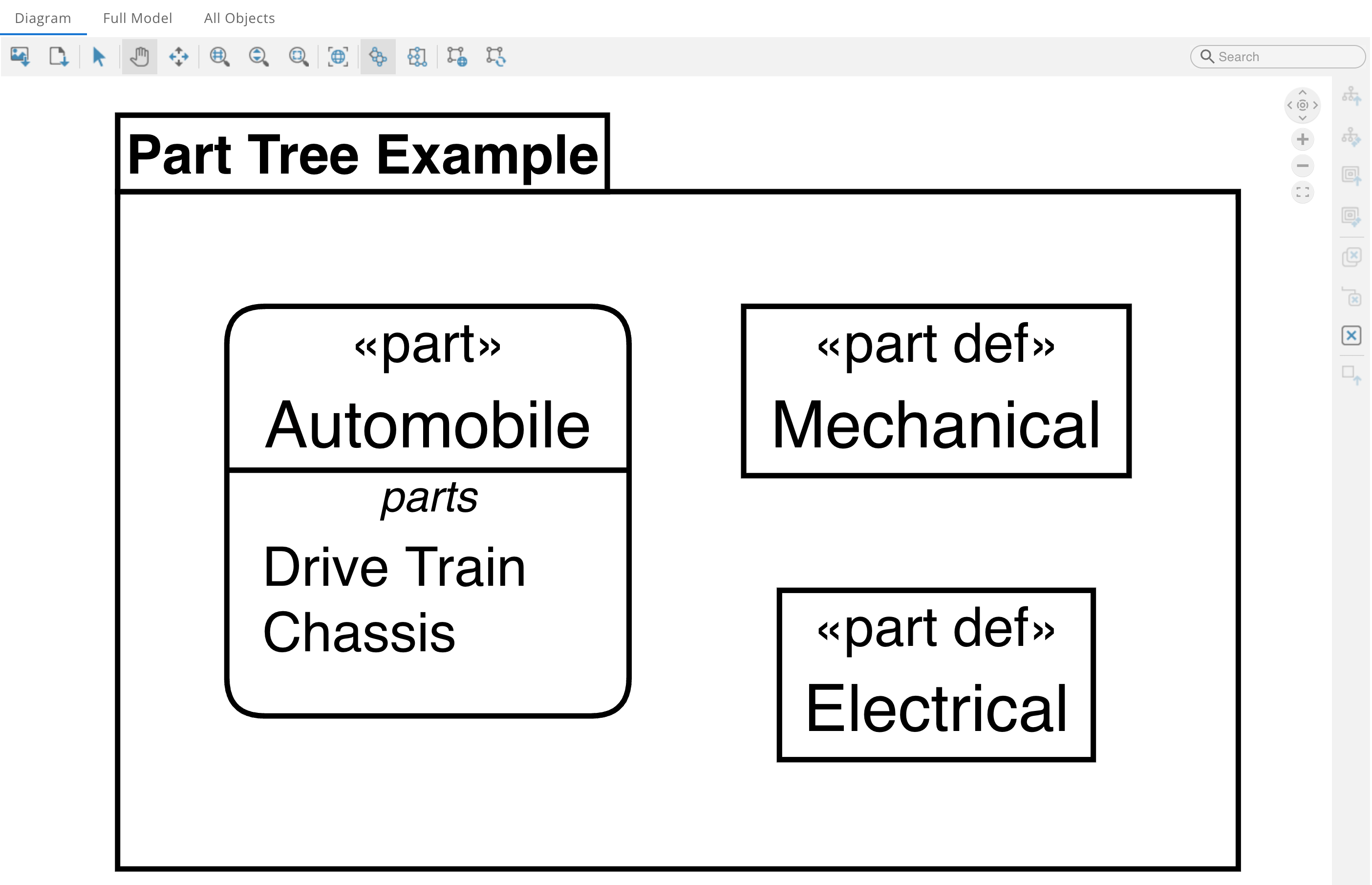 example.sysmlfile:package 'Part Tree Example' { part def Electrical; part def Mechanical; part Automobile { part 'Drive Train' { part Battery : Electrical; part Motor : Electrical; } part Chassis { part Suspension : Mechanical; part Body : Mechanical; } } }